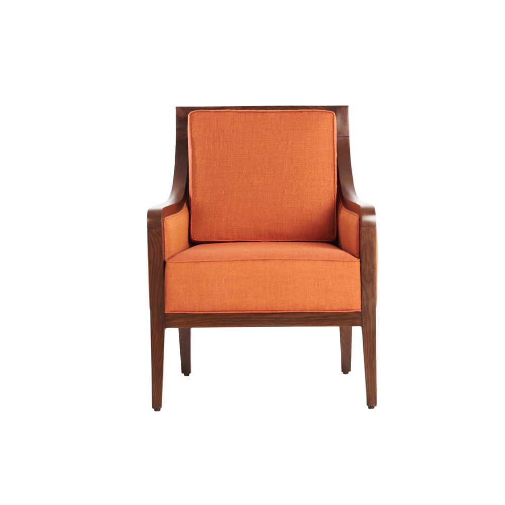 THE WOODEN CHAIR WITH AN ORANGE CUSHION