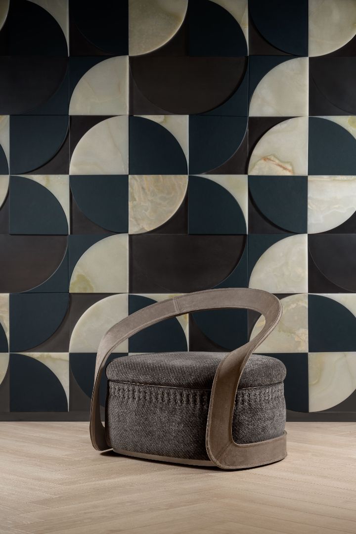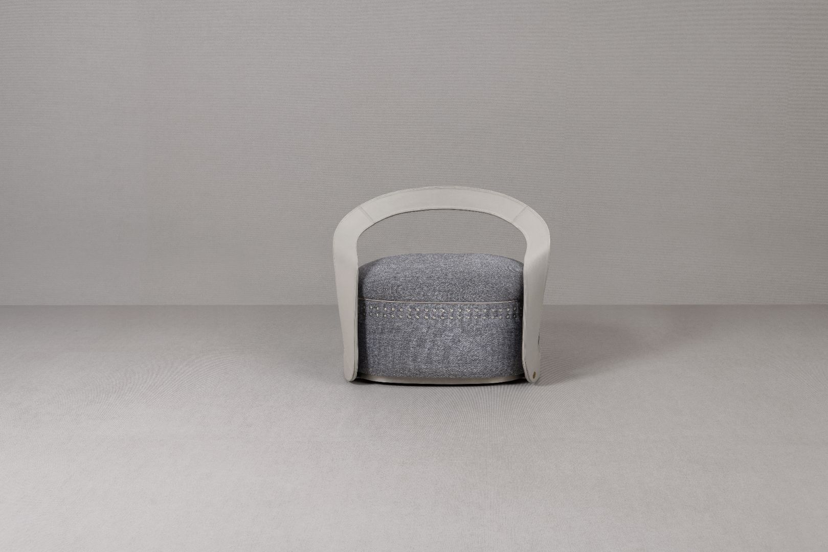 JULEE is a compact armchair defined by sculptural elegance and tailored detail. Fluid, continuous lines shape the armrests and base in a single gesture, creating a dynamic silhouette. Upholstery is enriched by a decorative studded band, highlighting craftsmanship.
