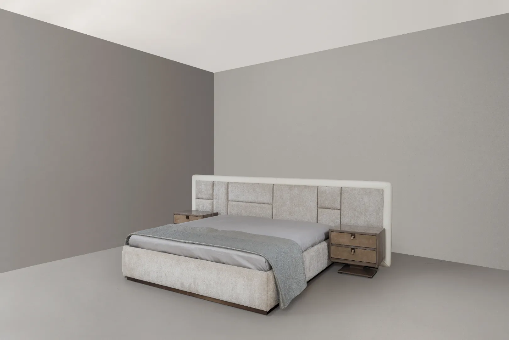 BE.03 invites relaxation through harmonious shapes and pure volumes. Its headboard features a refined geometric arrangement of padded panels, creating a balanced and contemporary design.