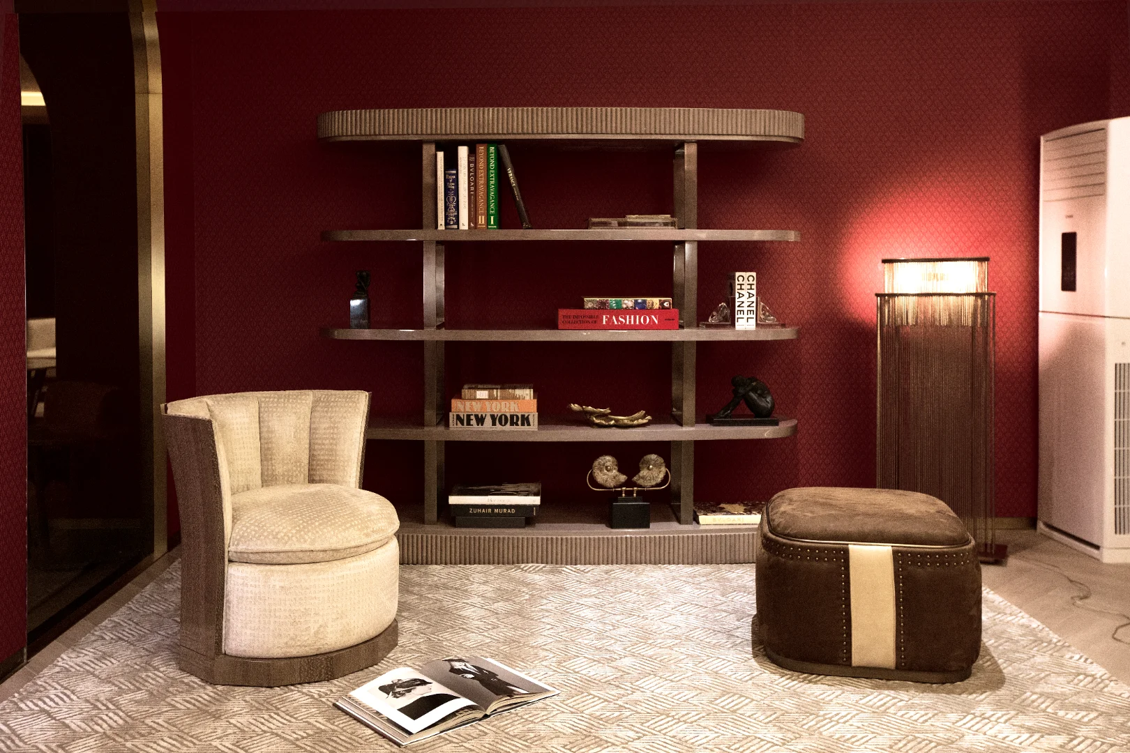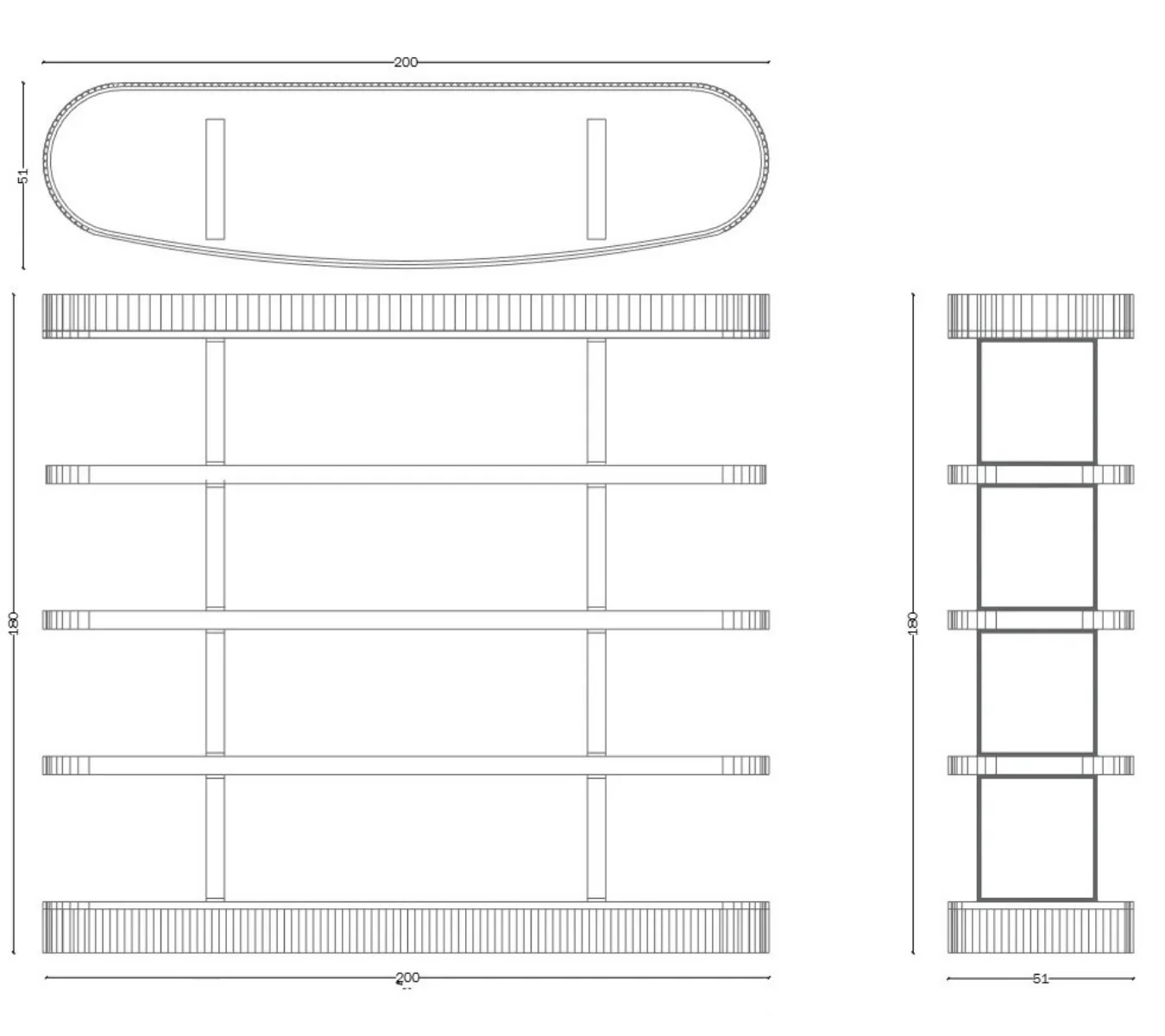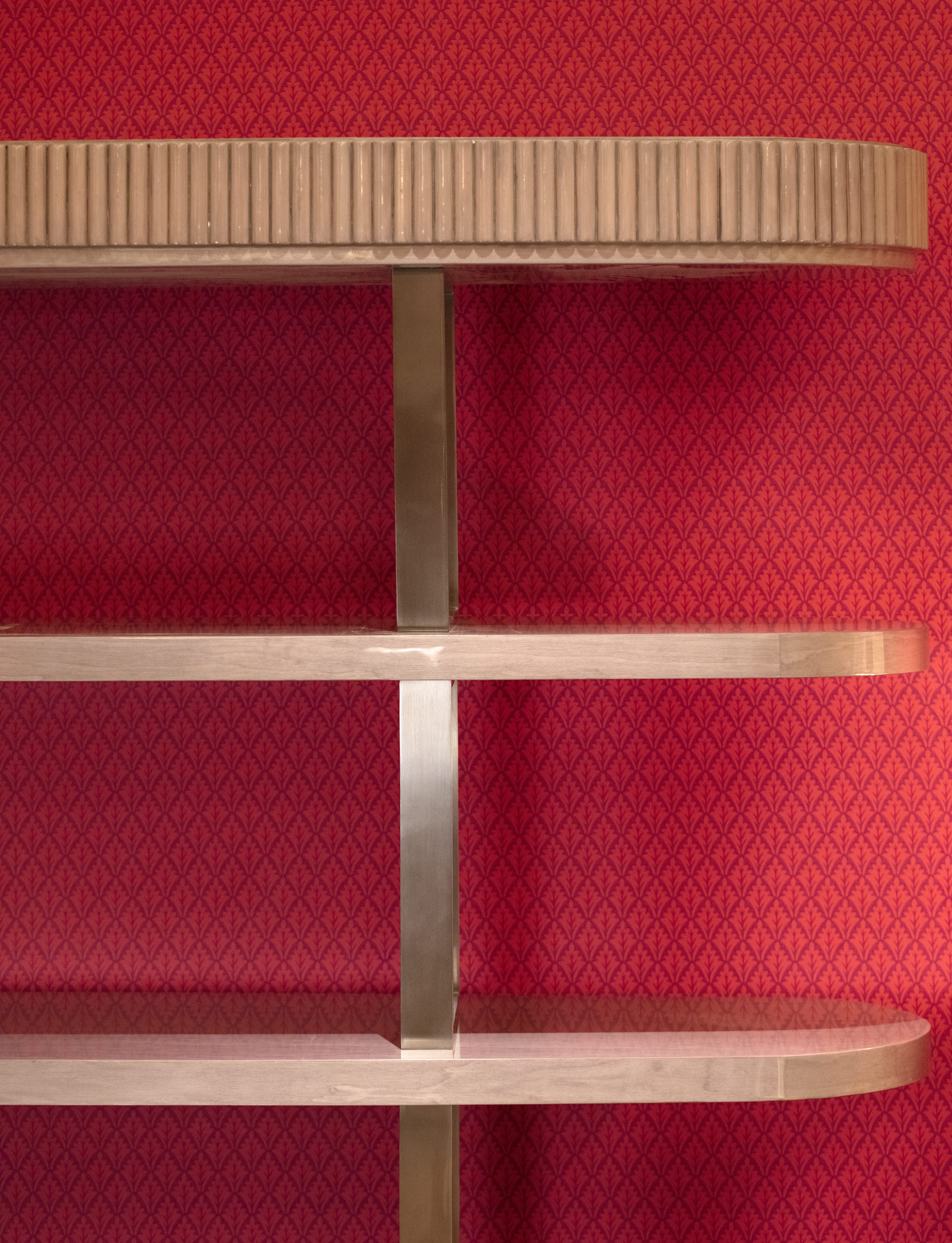 Hubert is a bookcase defined by impeccable rhythm. Oval shelves appear to float, supported by slender metal uprights that form a refined architectural grid. Fluted edges add a tactile, sophisticated detail. Its soft, symmetrical structure visually expands and harmonizes the space.