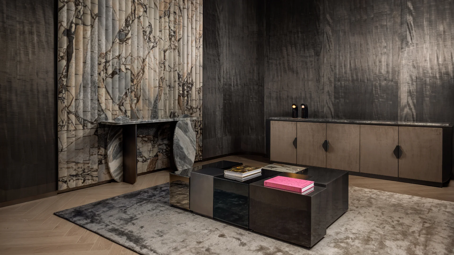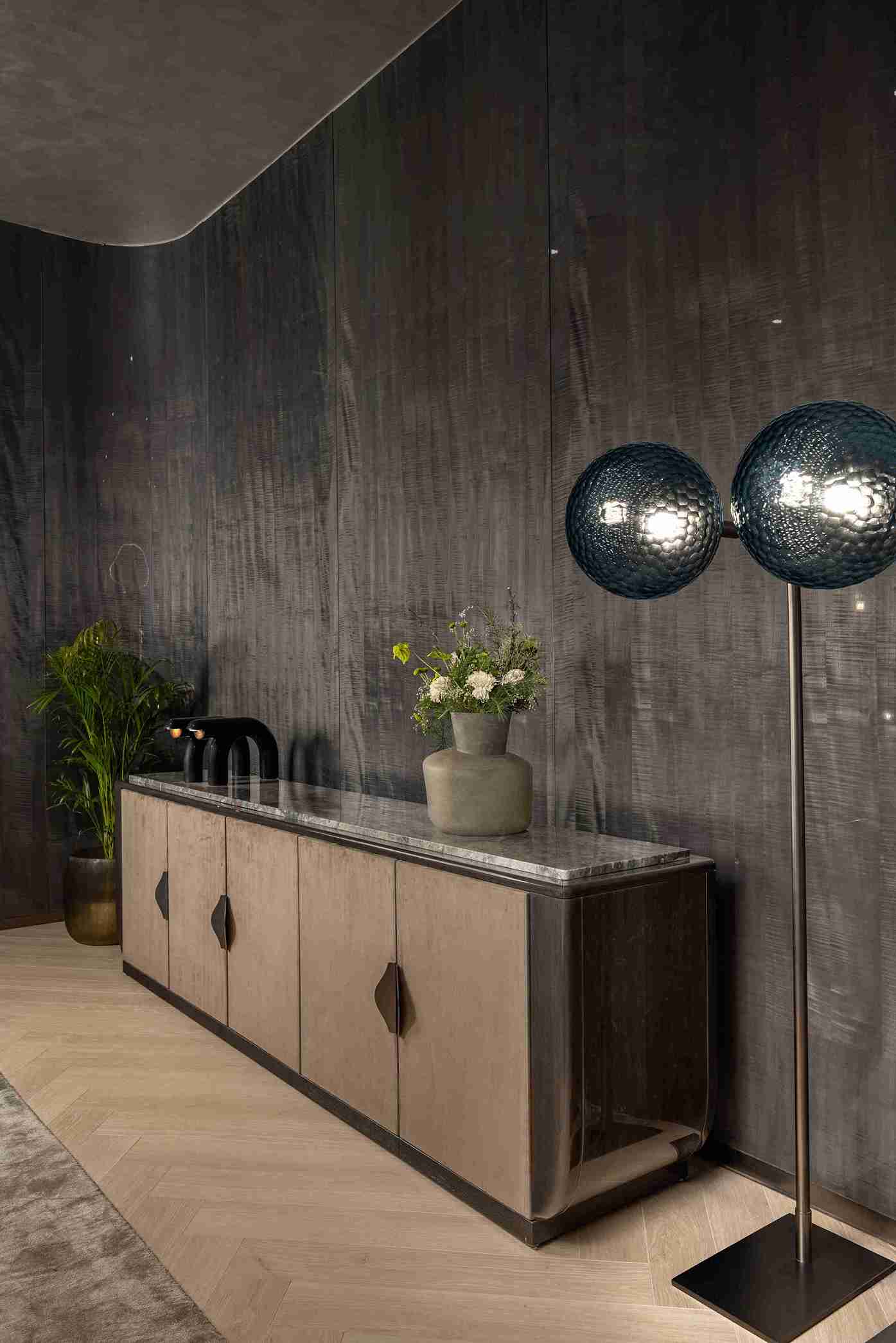 TRACEY CABINET expresses contemporary elegance through balanced volumes, refined materials, and subtle details. Its elongated form with rounded edges creates a calm, cohesive presence. Textured doors and integrated handles add rhythm and sophistication, while the natural stone top brings tactile contrast.