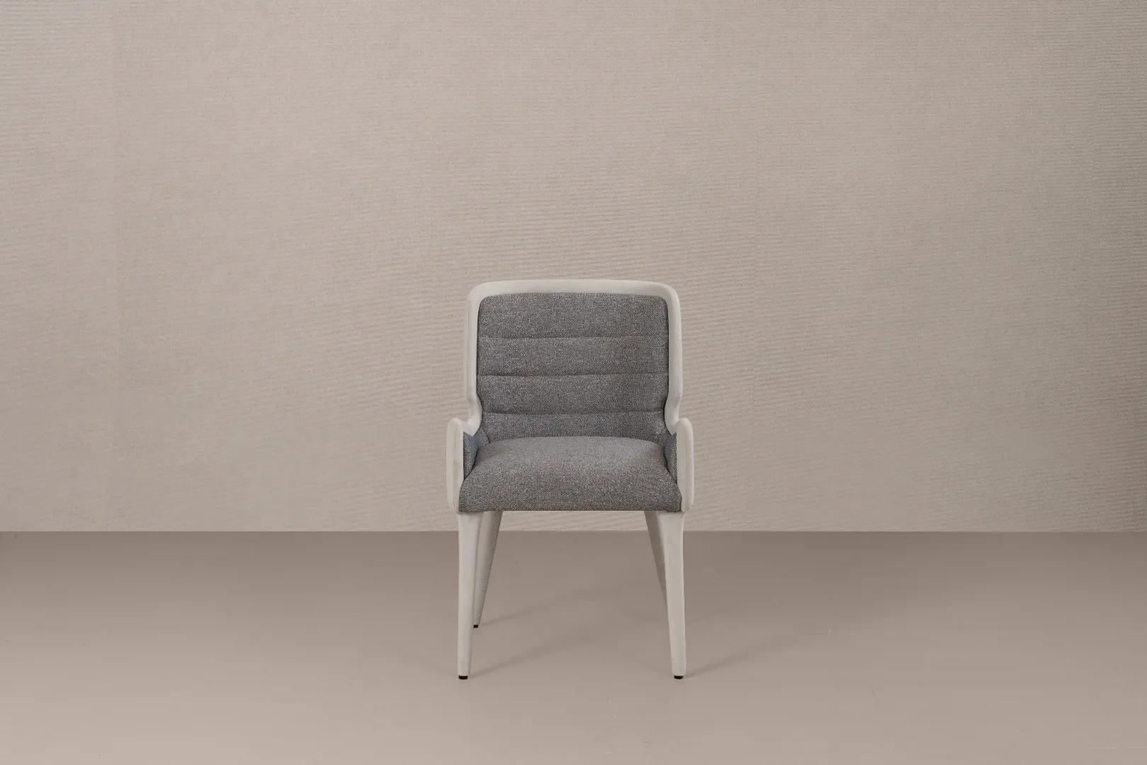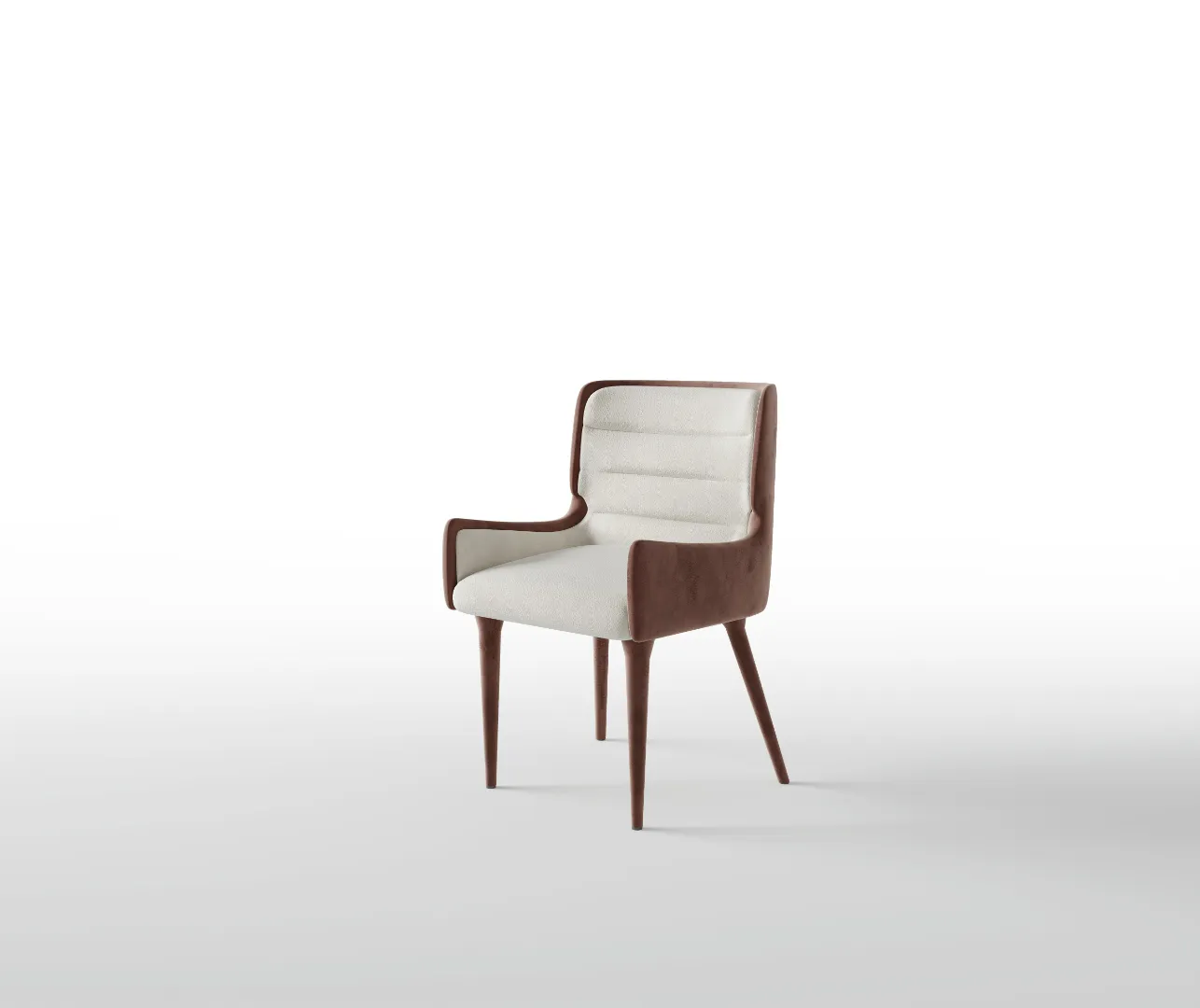CH.02 redefines the dining chair as a luxurious armchair designed for comfort and lasting moments. Upholstered in soft Nabuk leather, its frame wraps the structure with warmth and refined elegance. Inside, a textured fabric seat and backrest create a rich contrast, enhanced by horizontal padding that ensures ergonomic support.