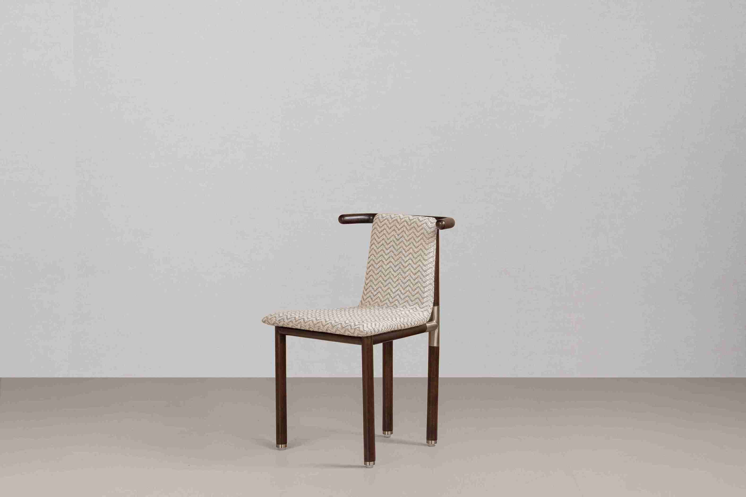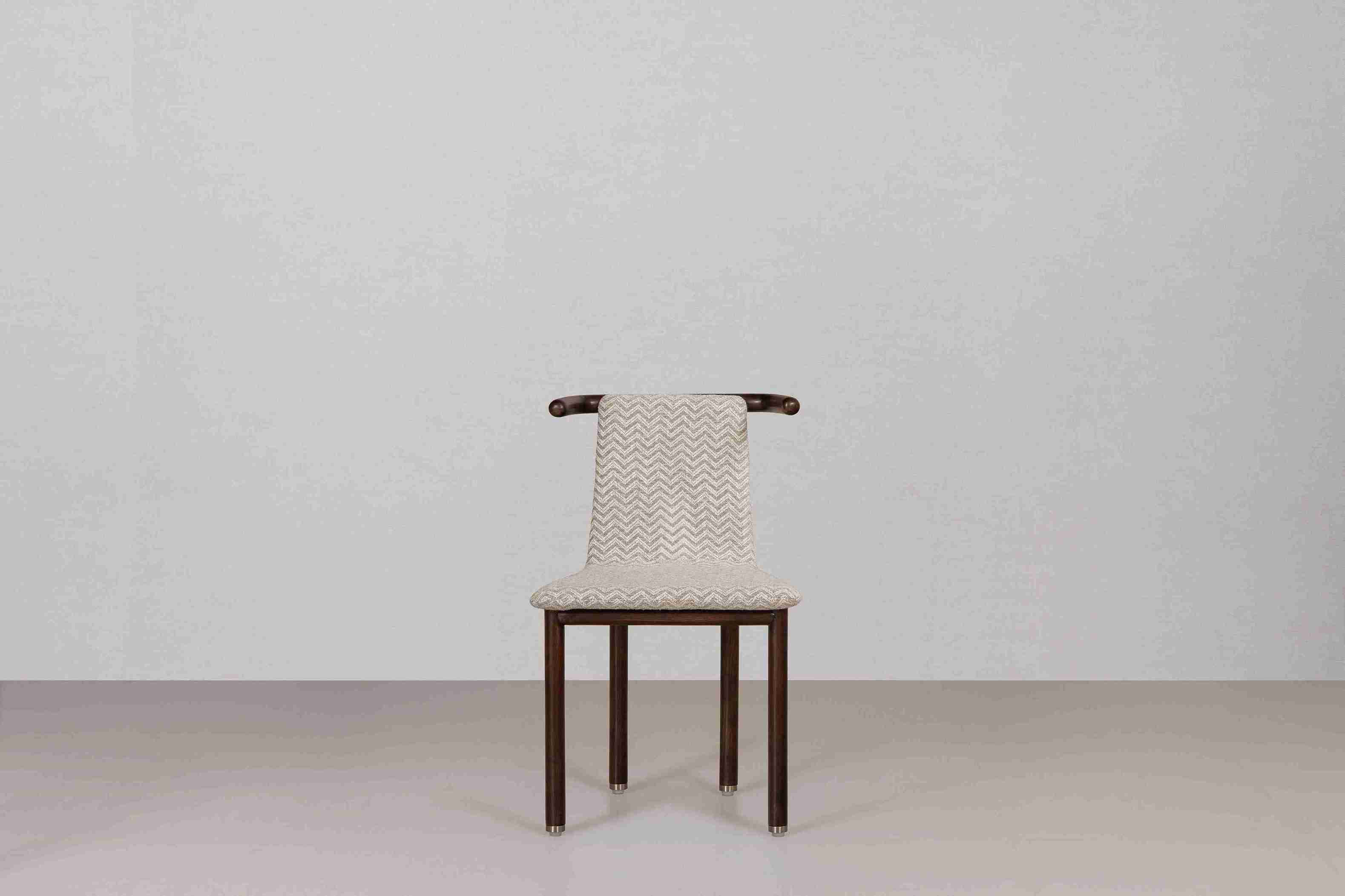 Géraldine celebrates fine woodwork with understated, timeless appeal. Gentle vertical lines frame a refined chevron-upholstered seat and back, while subtle metal accents at the legs add a discreet touch of luxury.