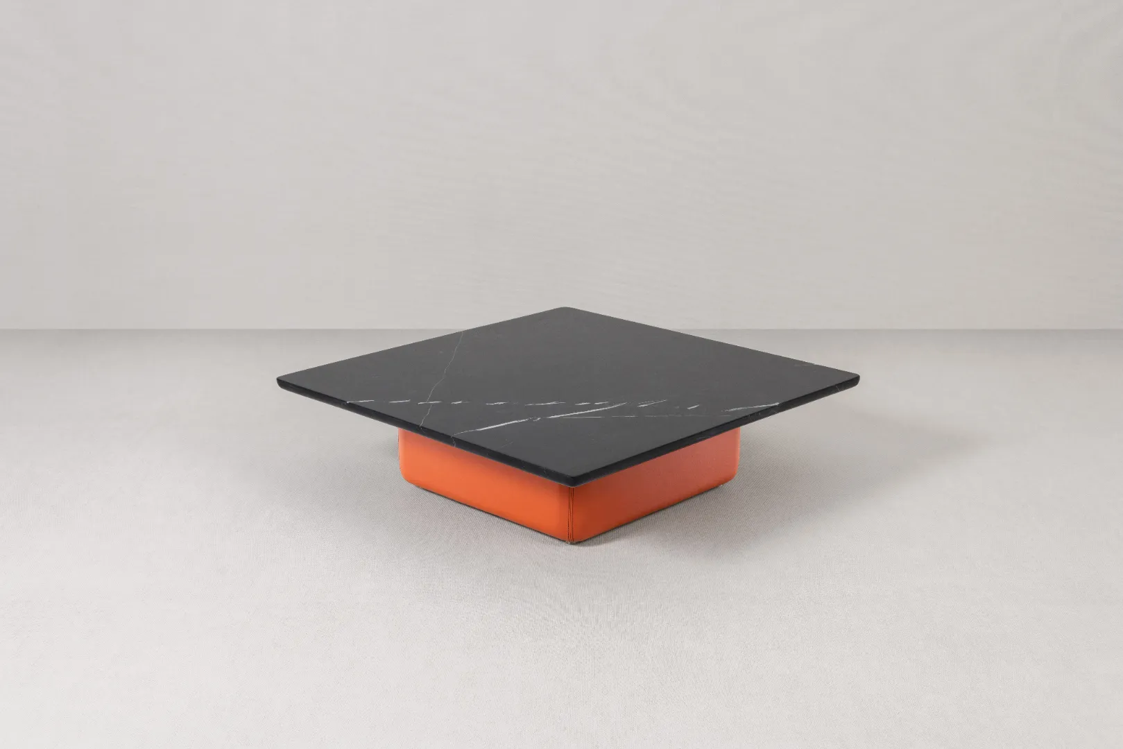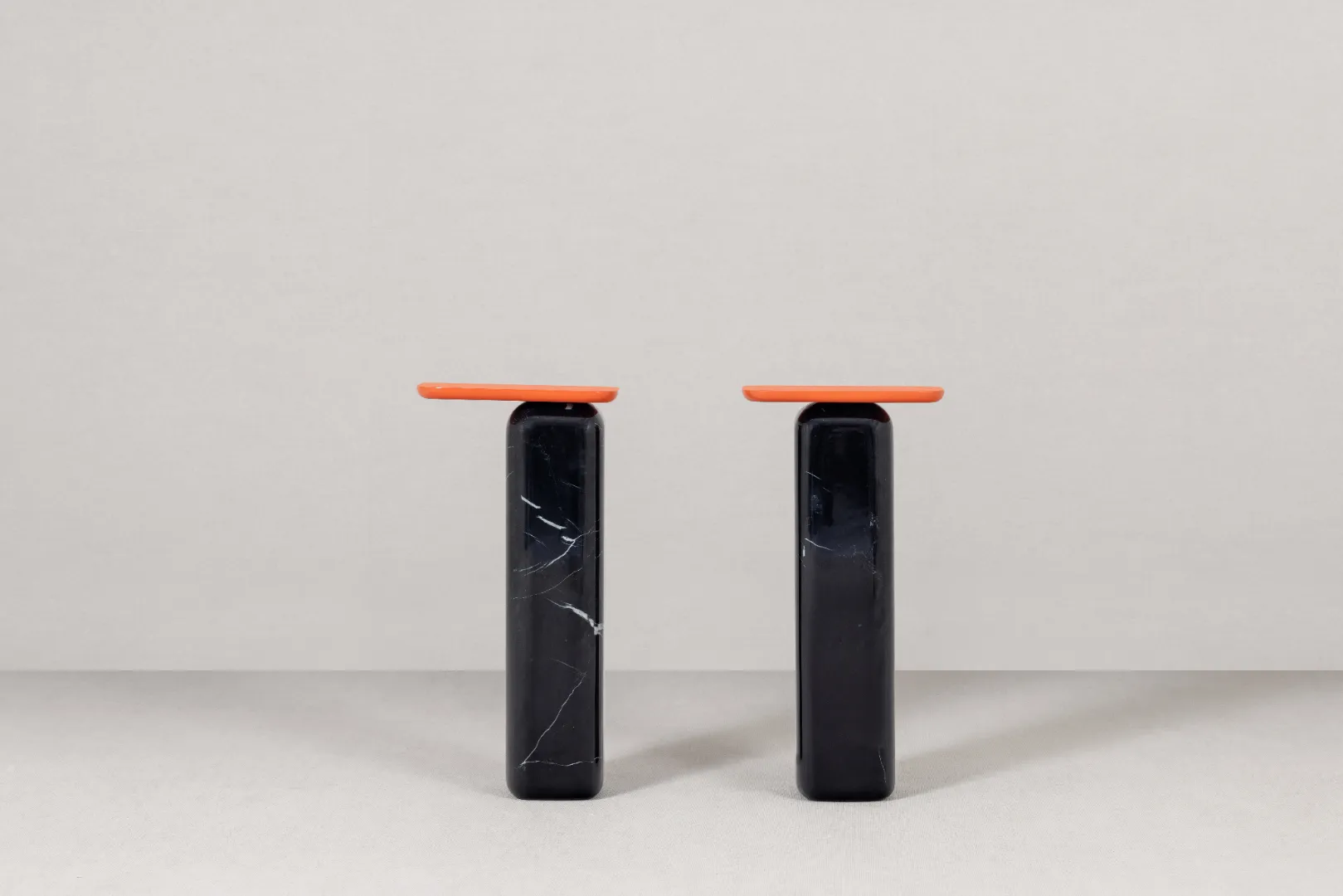 CTA.05 is more than a coffee table—it’s a functional sculpture with bold presence. Its totem-like central structure with glossy curved surfaces supports a polished marble top that seems to float, balancing strength and lightness.