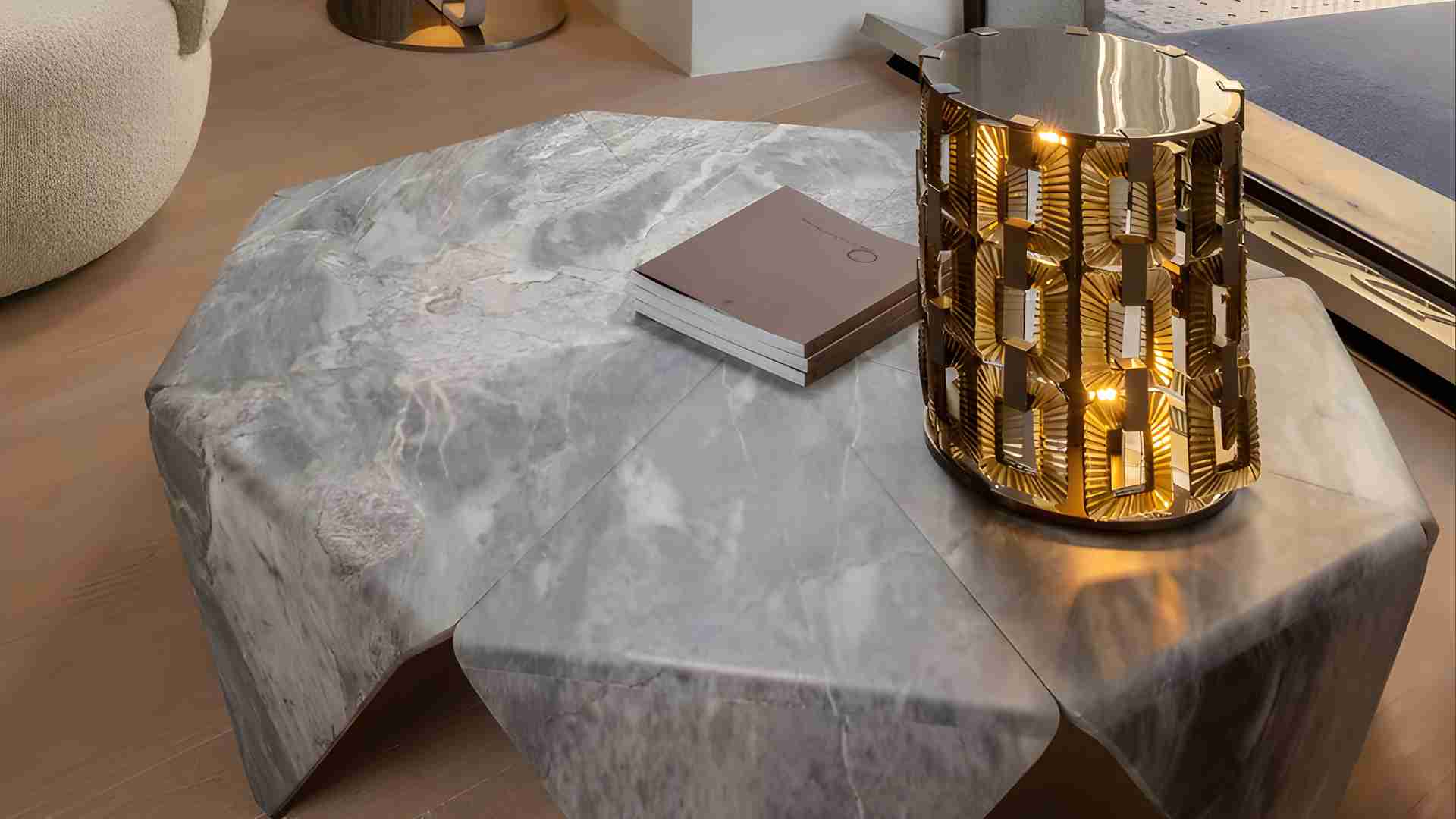 Baloise reimagines marble as a monumental coffee table, sculpted and folded like origami. Faceted surfaces cast delicate shadows and refined reflections, animating a powerful, architectural form.