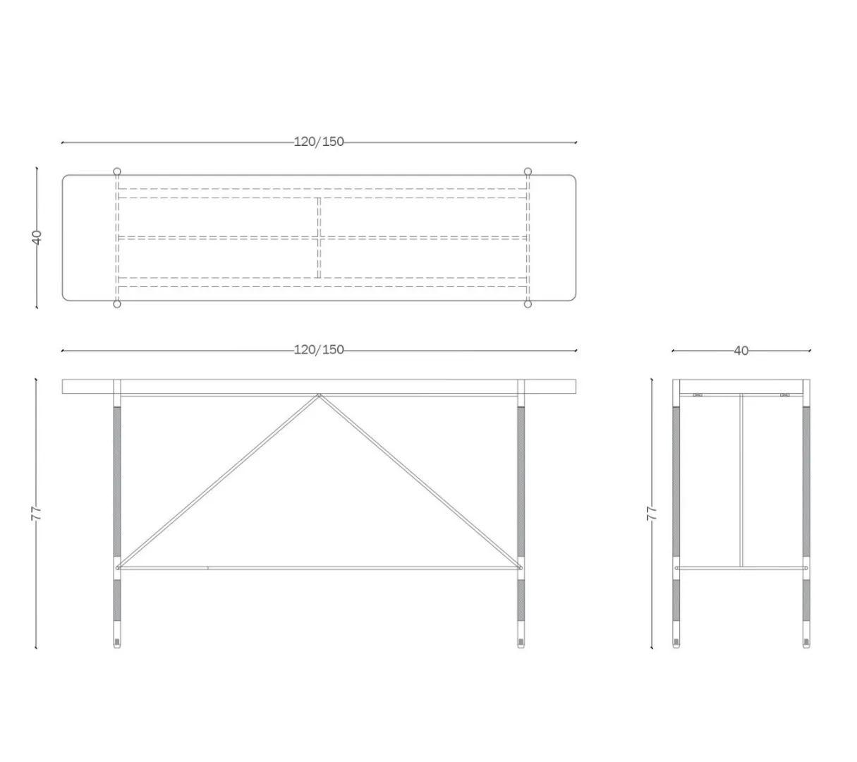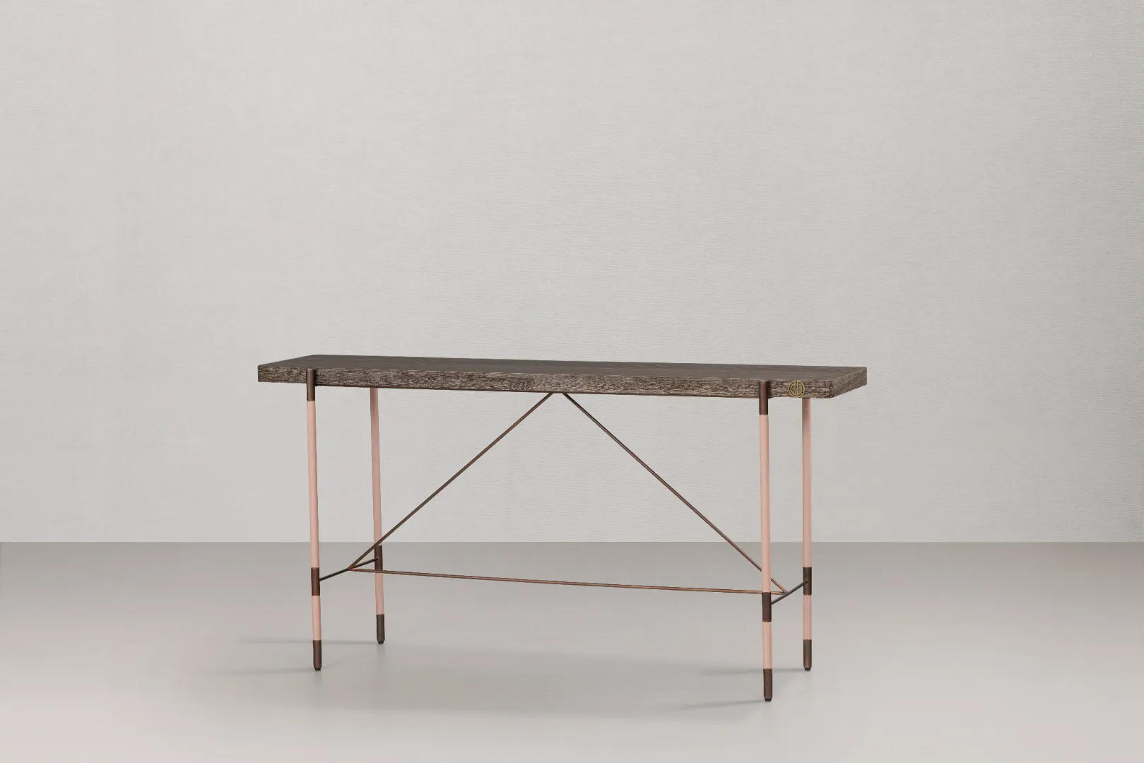 CO.01 is a console table that blends minimal design with refined functionality. Its slender metal frame with contrasting details supports a dark wood top, balancing lightness and solidity.