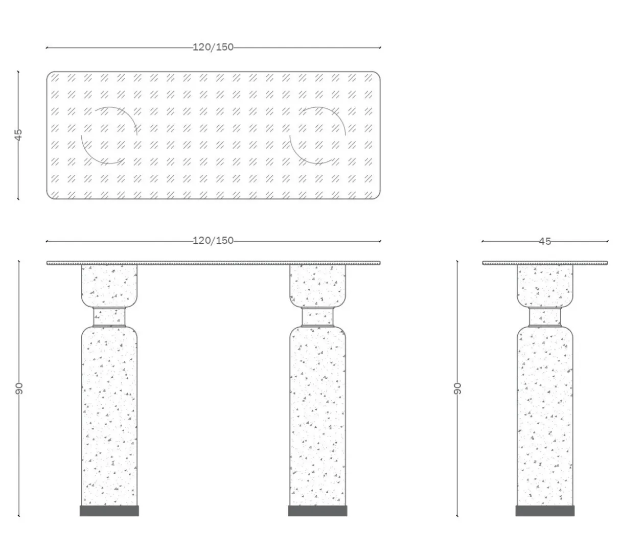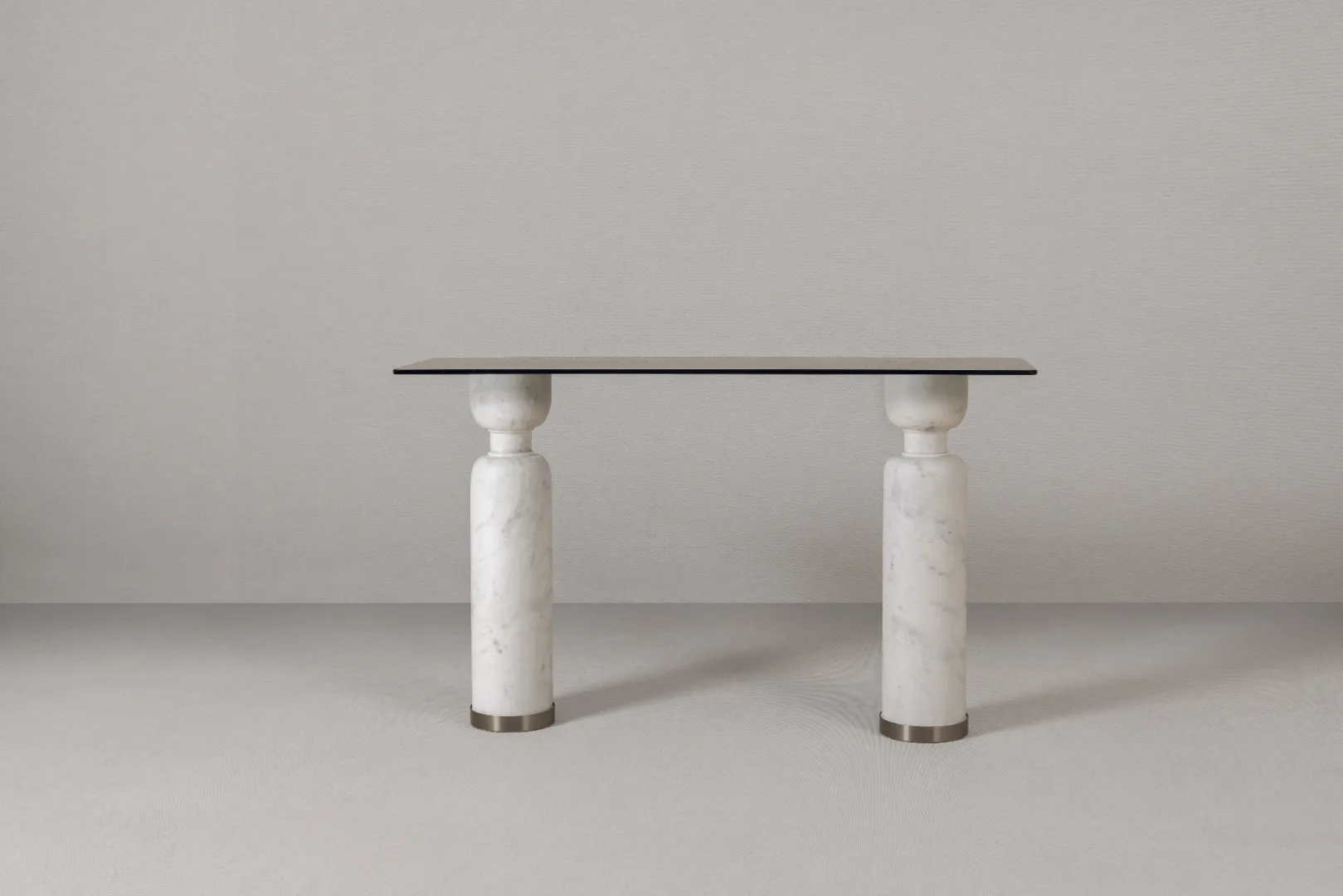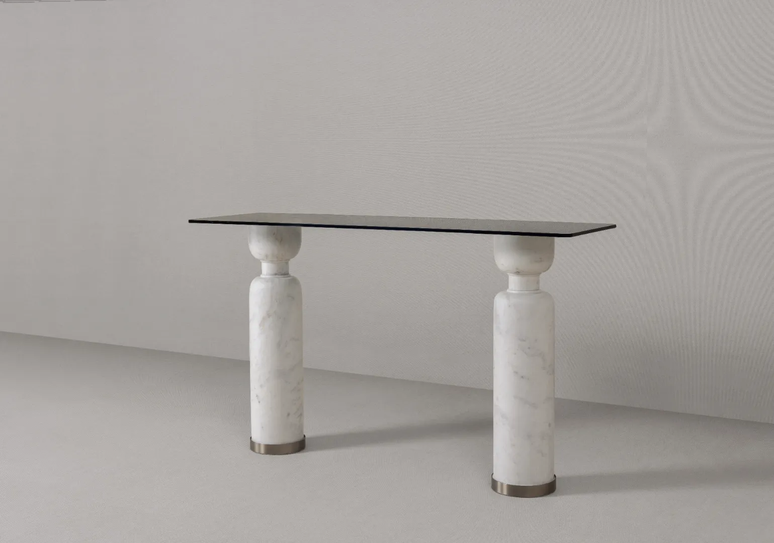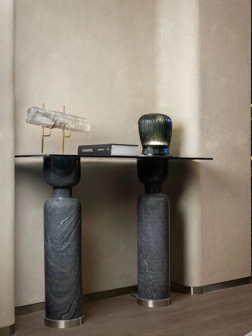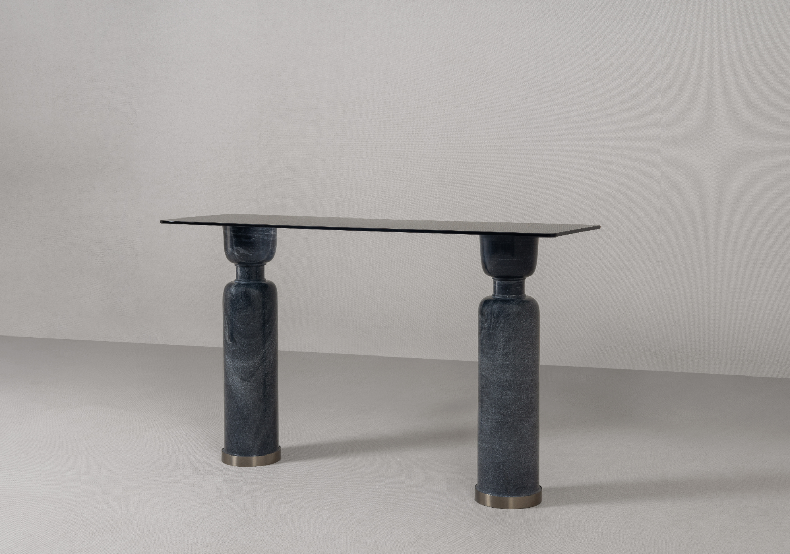 CO.03 is a console table defined by strong material identity and sculptural presence. Two natural stone columns form the base, offering solidity and clean design, while a thin top in glass or refined materials creates visual lightness.