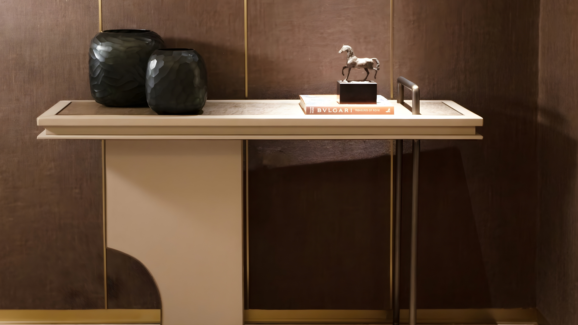 Paulette stands out through its details. An asymmetrical, architectural design draws the eye, giving the console strong character and personality. Carefully balanced elements harmonize with the space, making it a natural focal point.