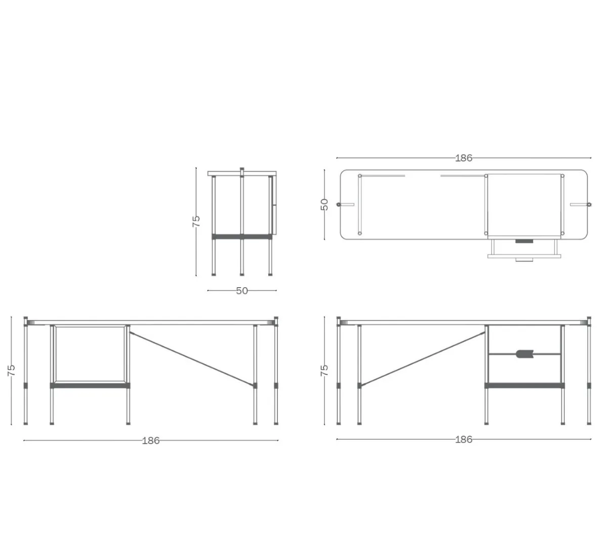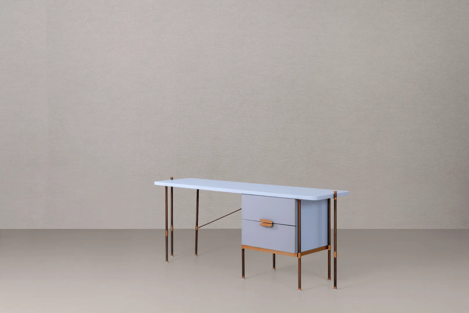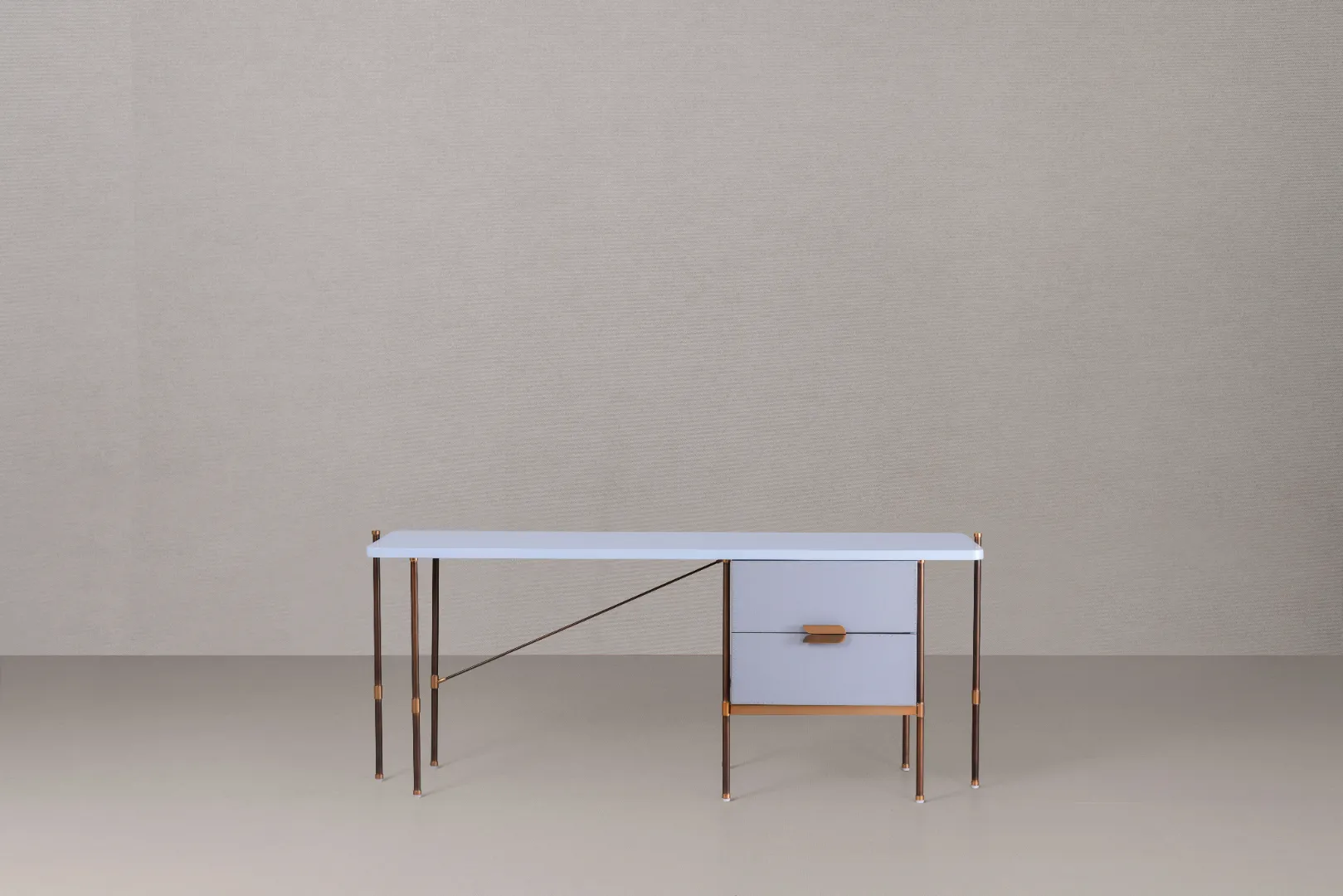 CO.02 is a sleek, refined console desk that combines practicality with style. Its slender metal frame with contrasting details supports a smooth, spacious top, while a two-drawer module ensures efficient organization.