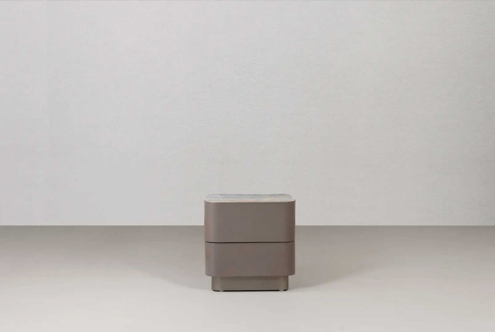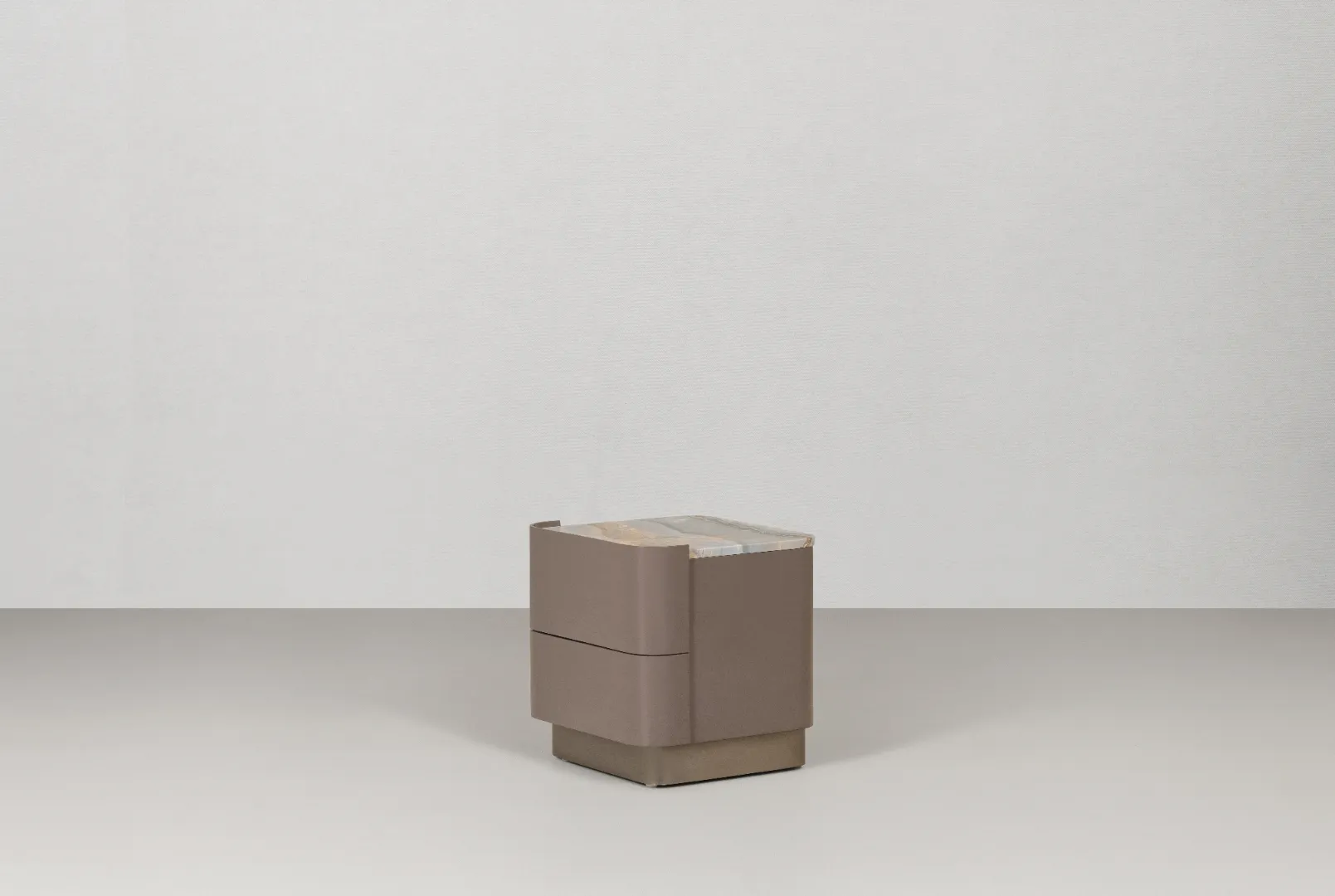 NST.01 redefines the bedside table as a small architectural piece. Smooth, continuous surfaces form a compact, harmonious volume, enhanced by a marble top that adds light and refined texture. Integrated drawers offer seamless, quiet functionality.