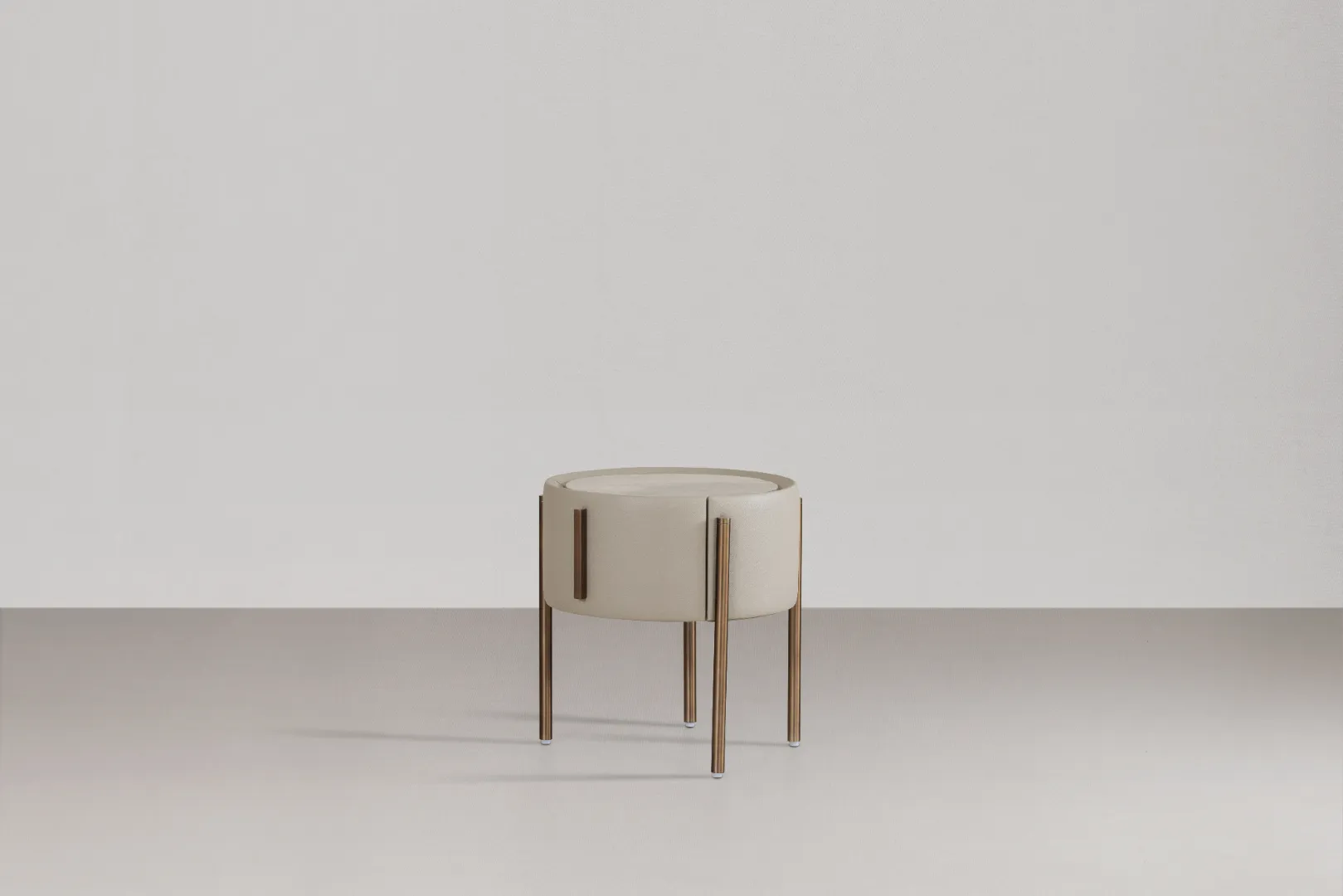 Leather upholstery adds warmth, while the contrasting top introduces subtle visual calm. An open niche and curved drawer provide functional balance between display and storage. NST.07 reflects understated luxury, where material quality and form define serene elegance.
