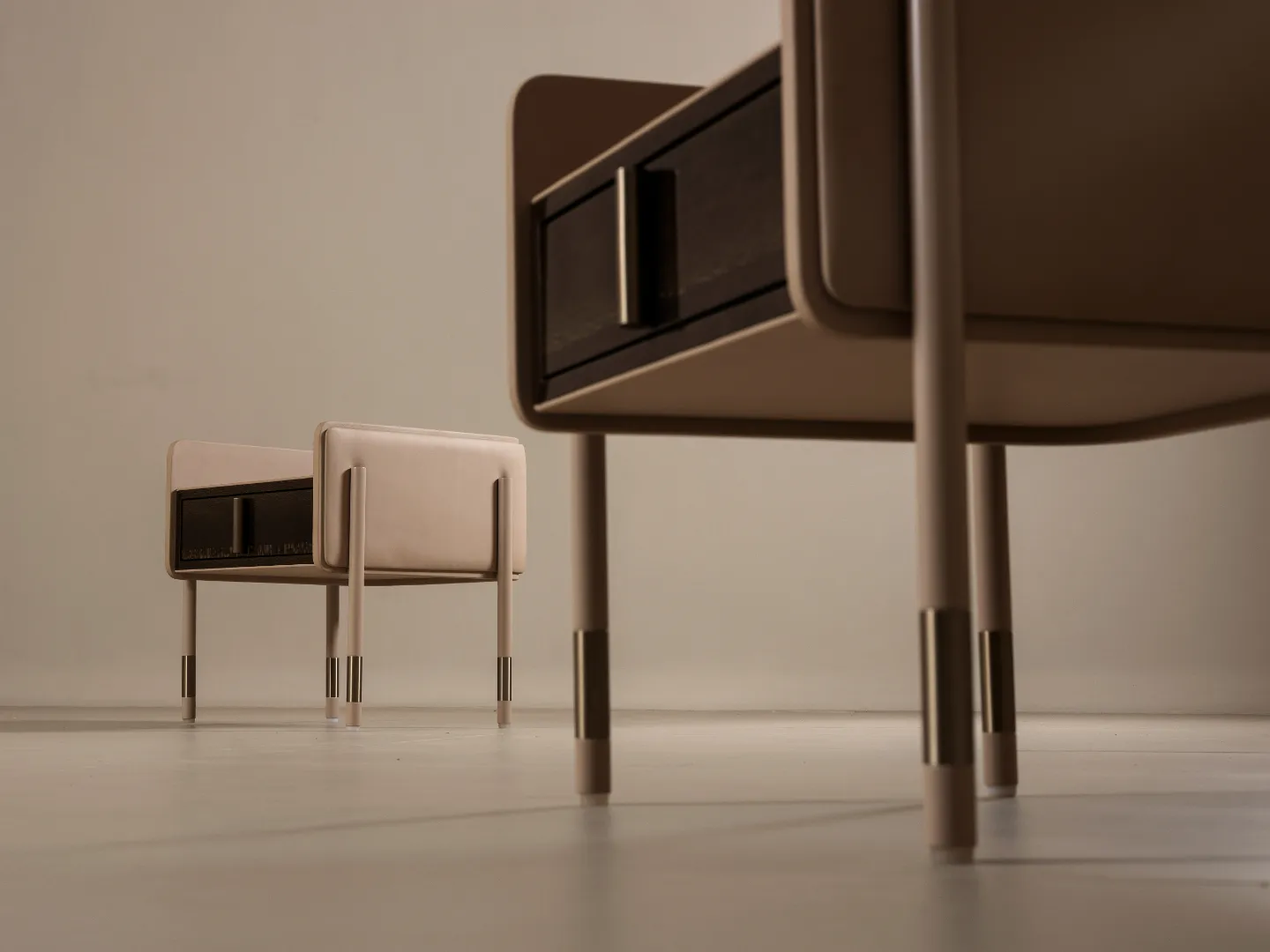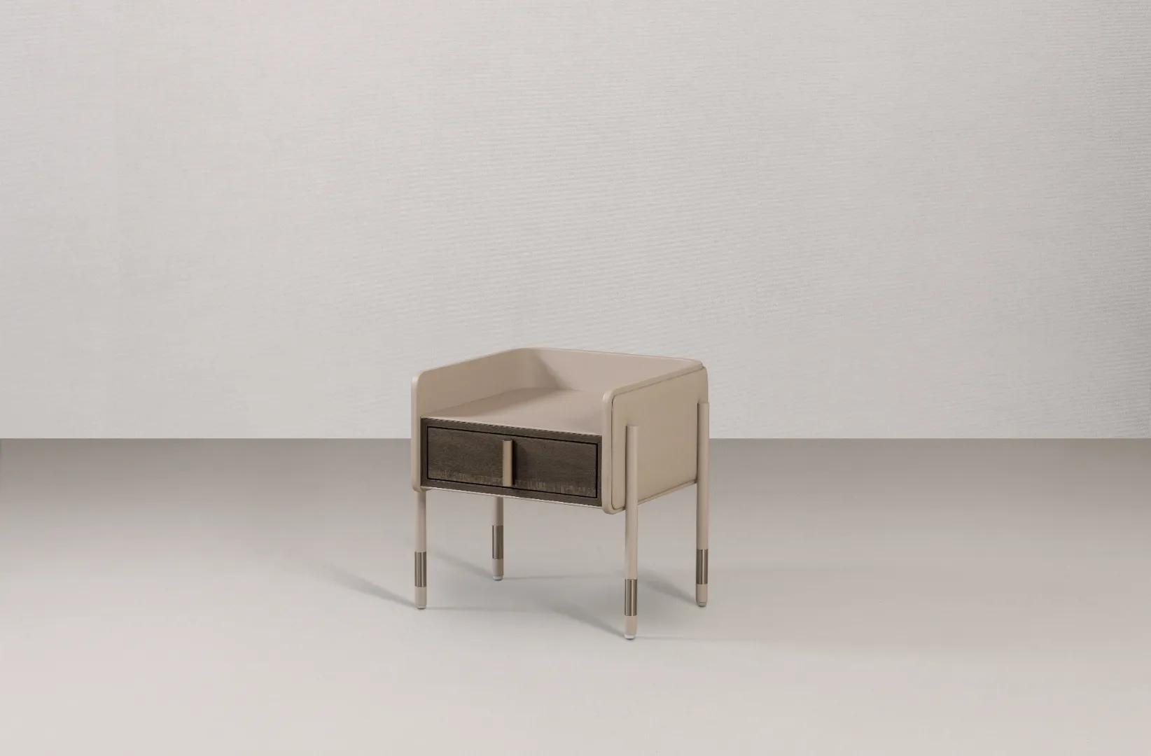 NST.04 balances visual lightness with material strength. Its curved, leather-clad frame contrasts with the geometric precision of the wooden drawer, creating harmony between softness and structure. Metallic leg accents add rhythm and brightness.