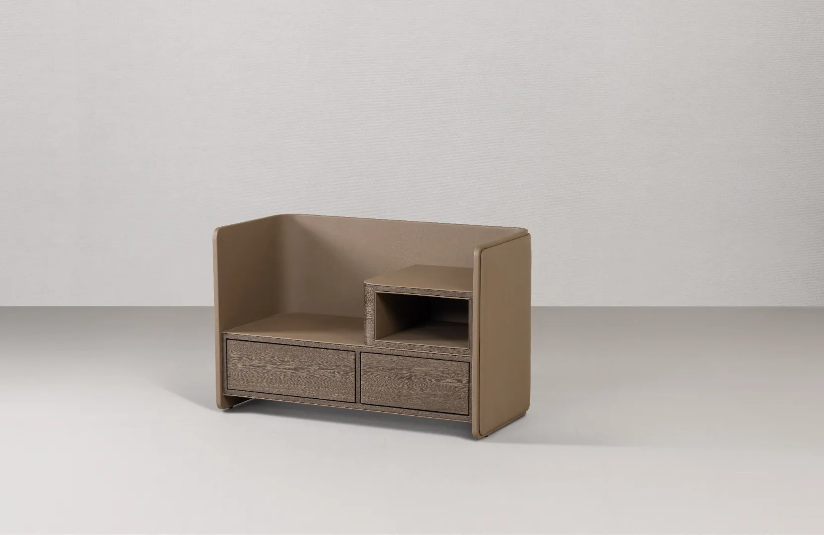 NST.05 is more than a nightstand it’s a gesture of care for intimate spaces. Its soft, leather-clad curved form creates a sense of calm and protection. Contrasting dark wood drawers reveal natural texture while offering smooth, practical storage.