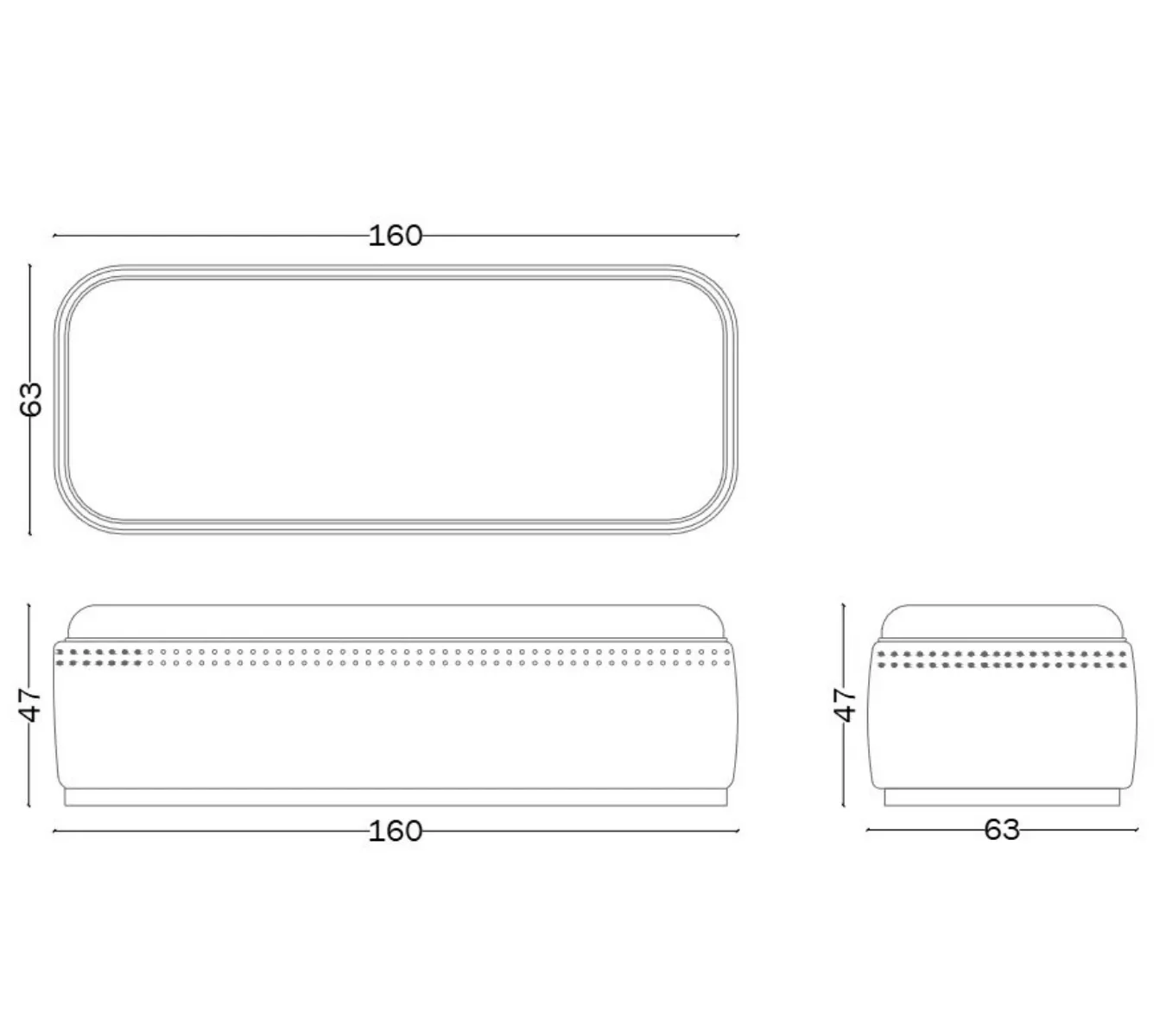 The AMELIE bench reflects the harmonious spirit of the collection through an elegant elongated silhouette and a generously welcoming seat. Its refined proportions create visual balance, while a delicate studded trim introduces rhythm and a touch of luxury.