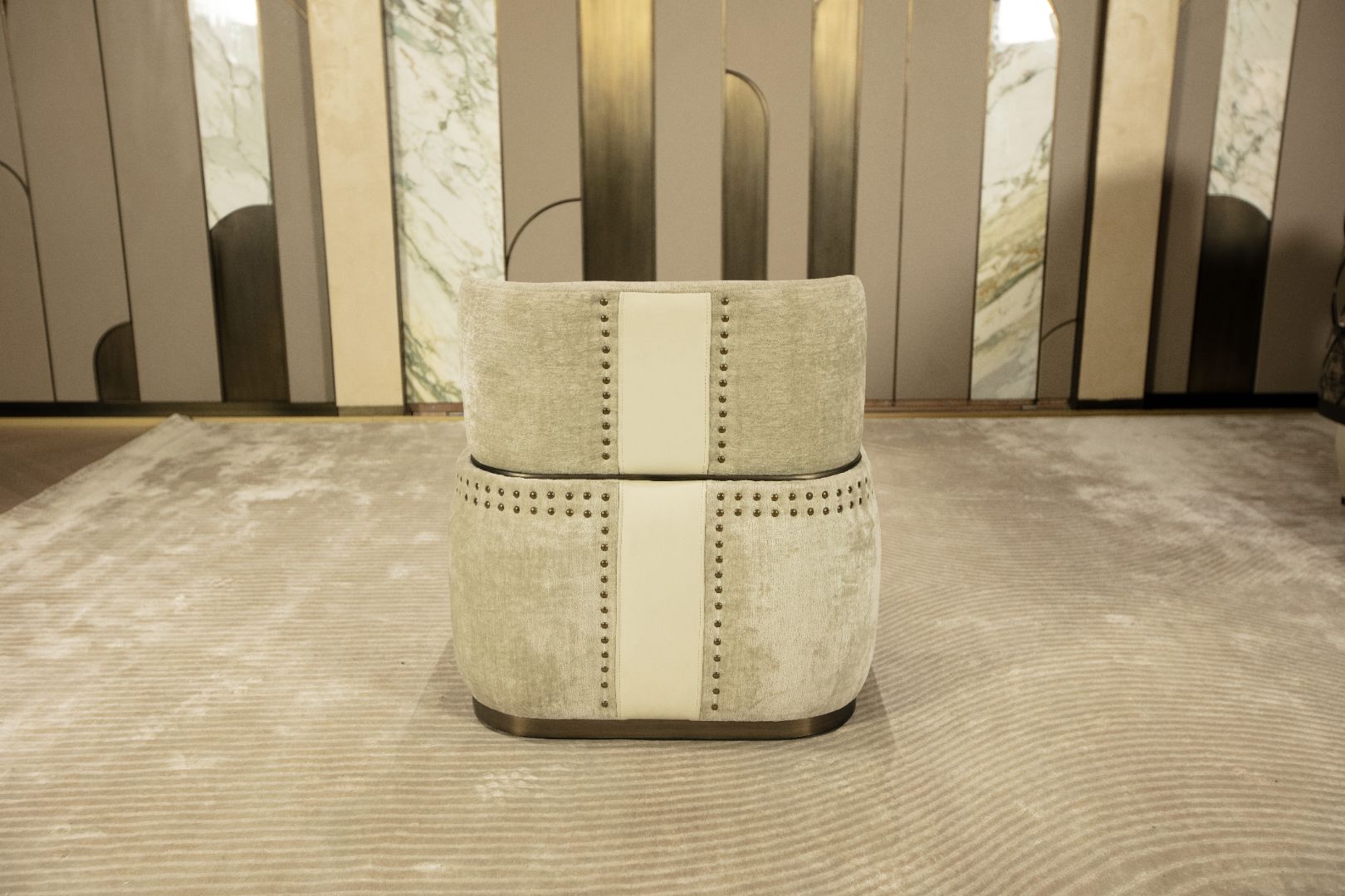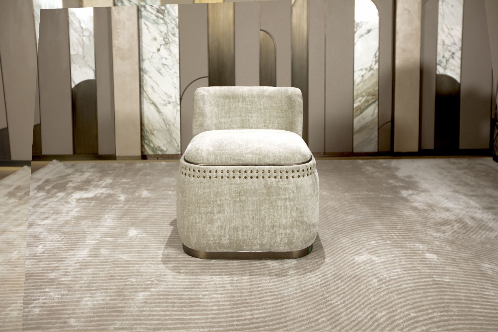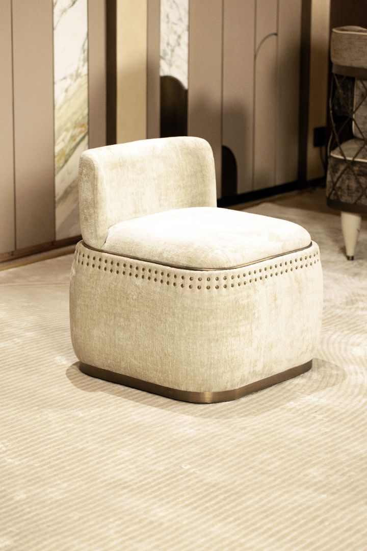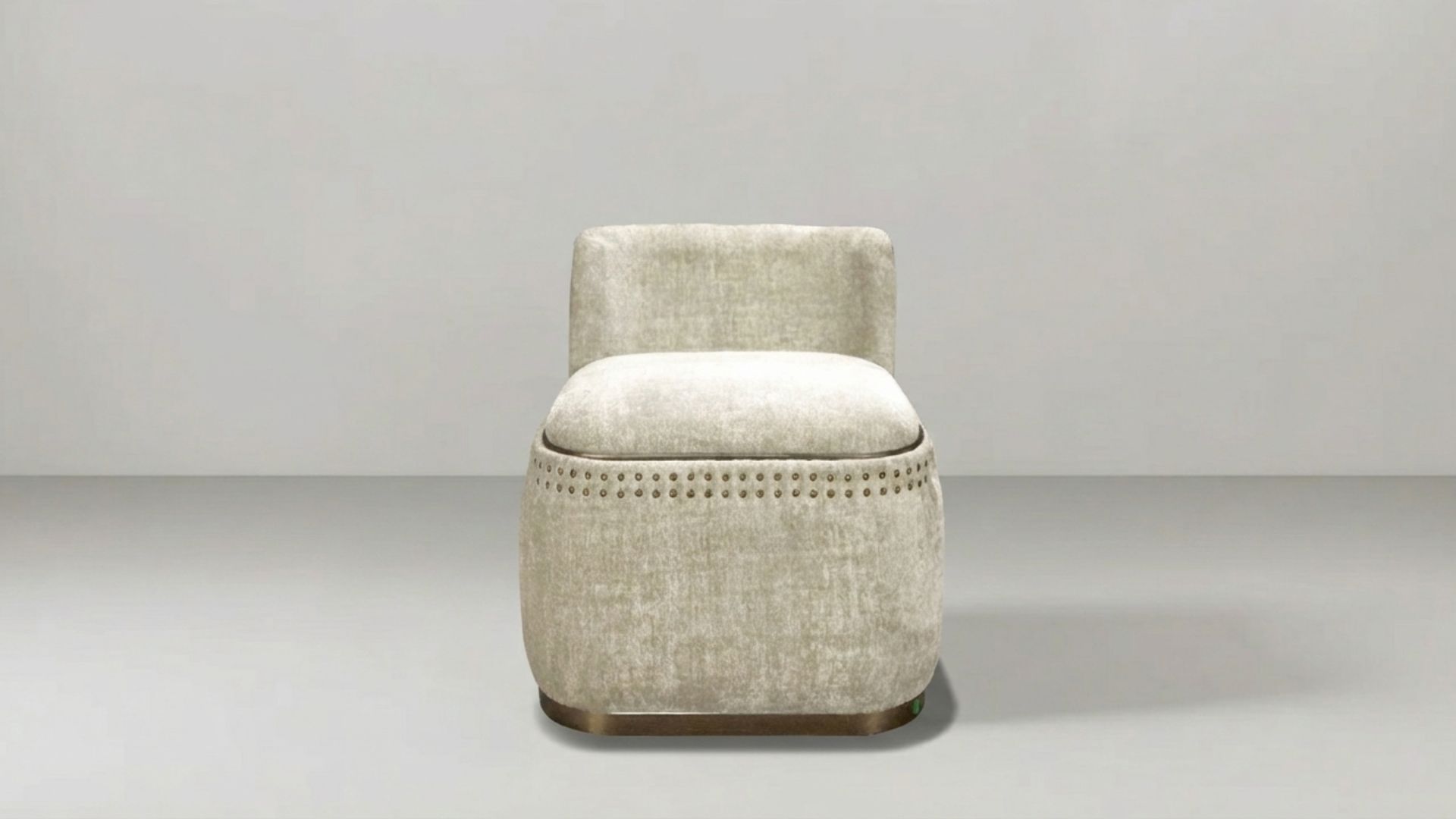 AMELIE evokes a delicate, timeless femininity through soft volumes and refined proportions. Its rounded silhouette and elegant upholstery recall couture craftsmanship, while a metallic stud trim traces the profile like a piece of jewelry.