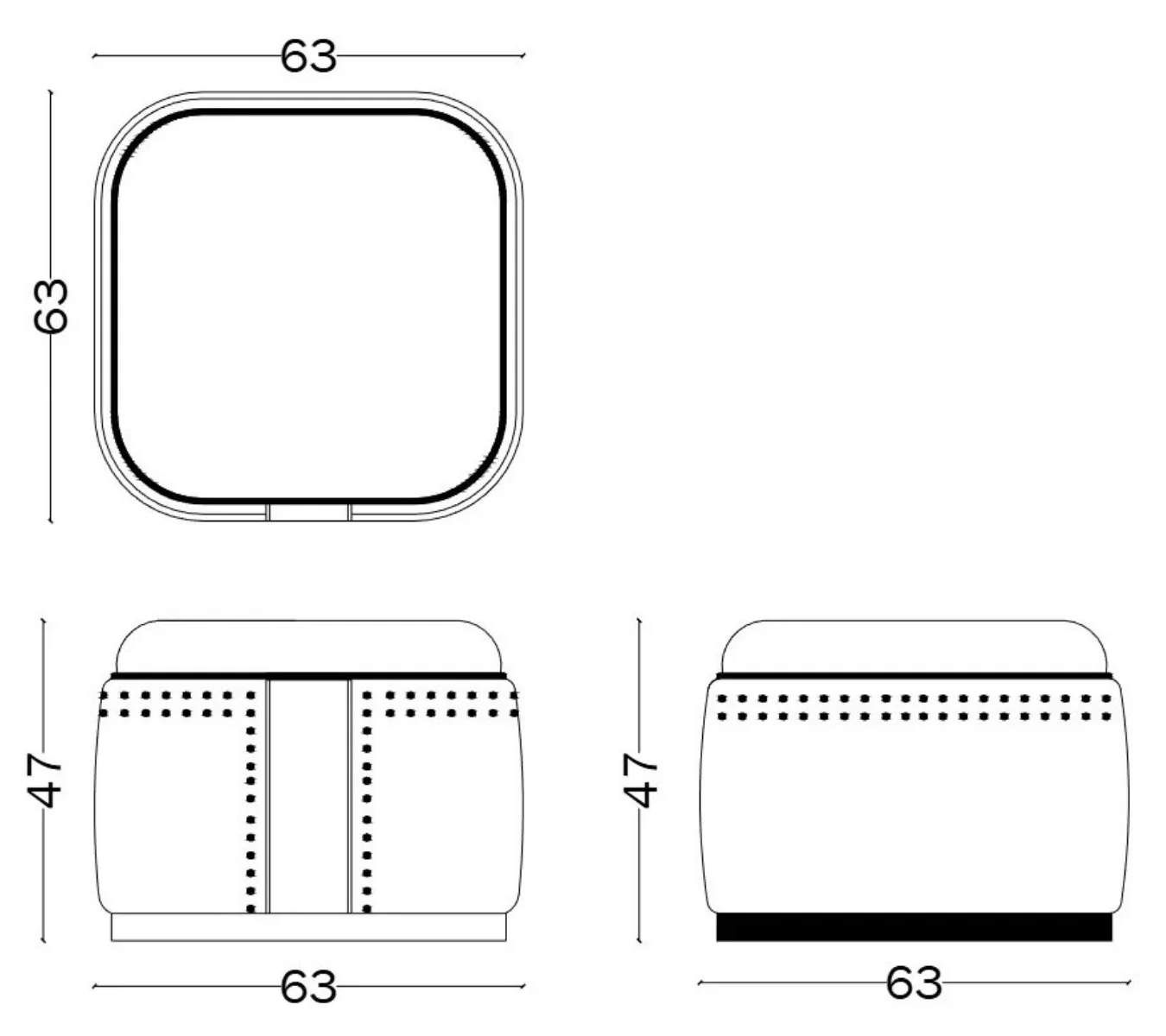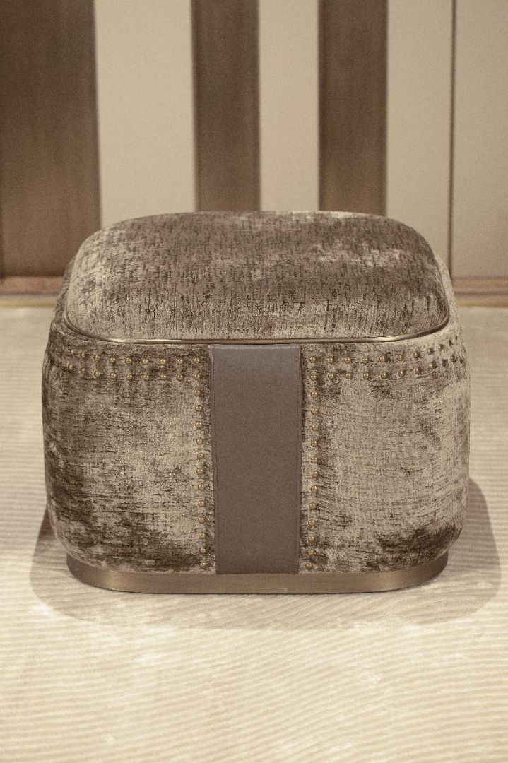 A soft, generous silhouette is defined by a vertical leather band and a refined line of metal studs, adding subtle rock-chic character. Versatile and elegant, Amelie elevates interiors as a footstool or occasional seat, where detail defines true grandeur.