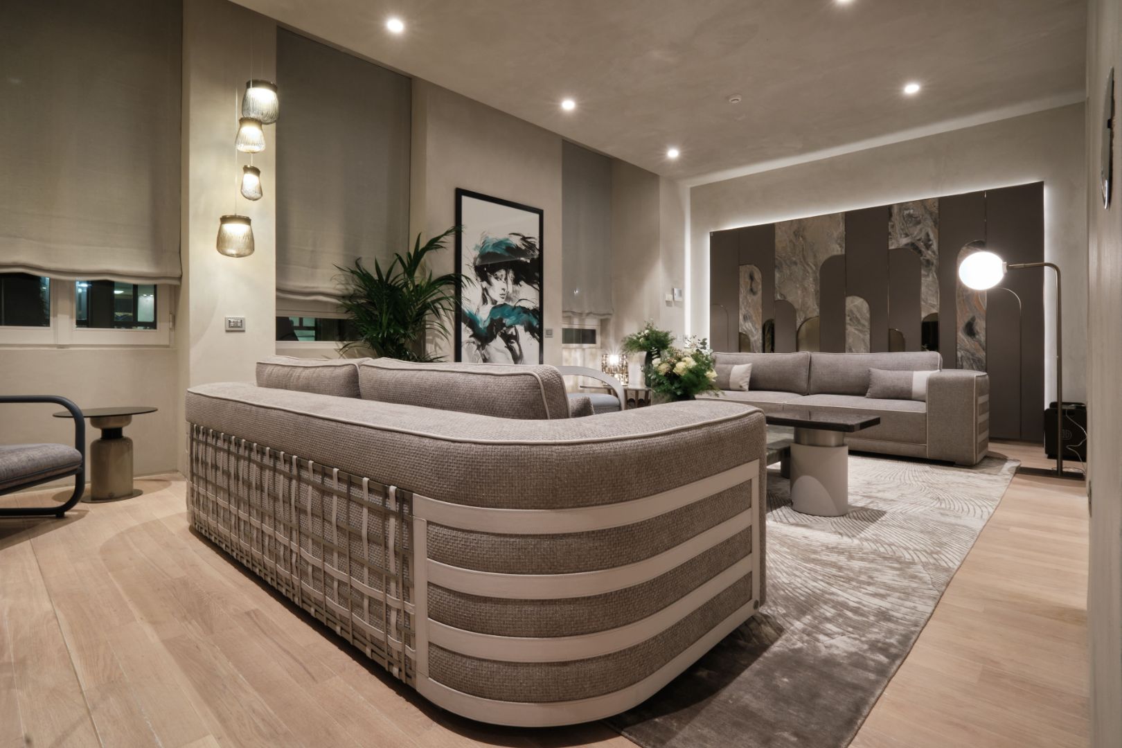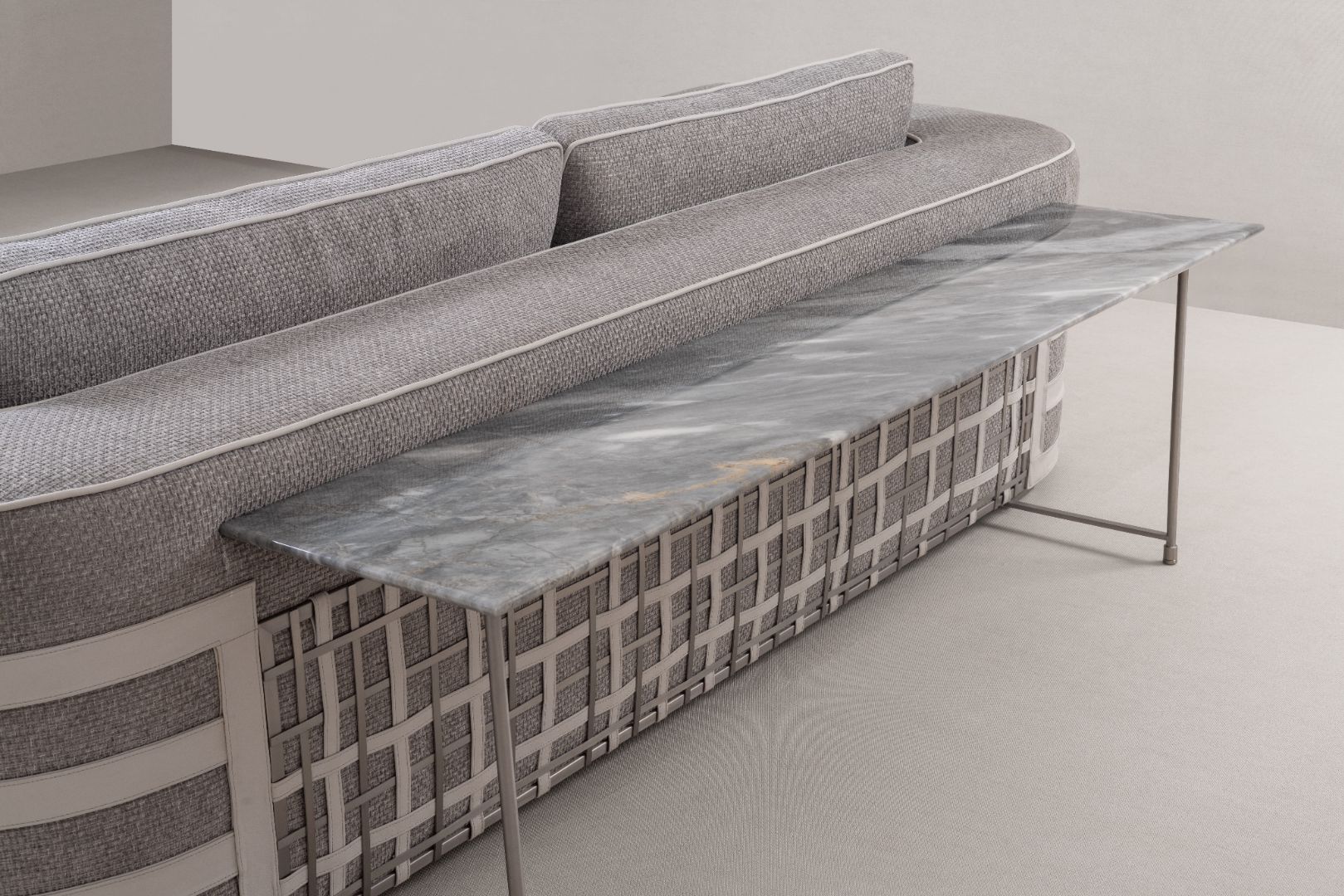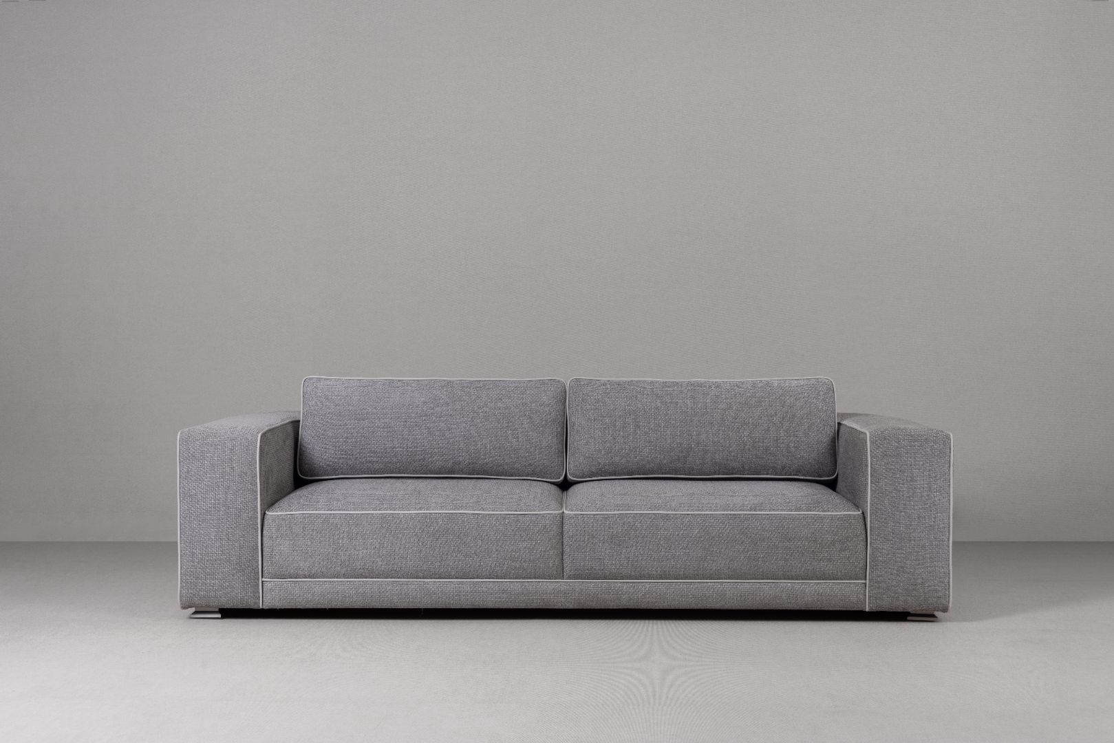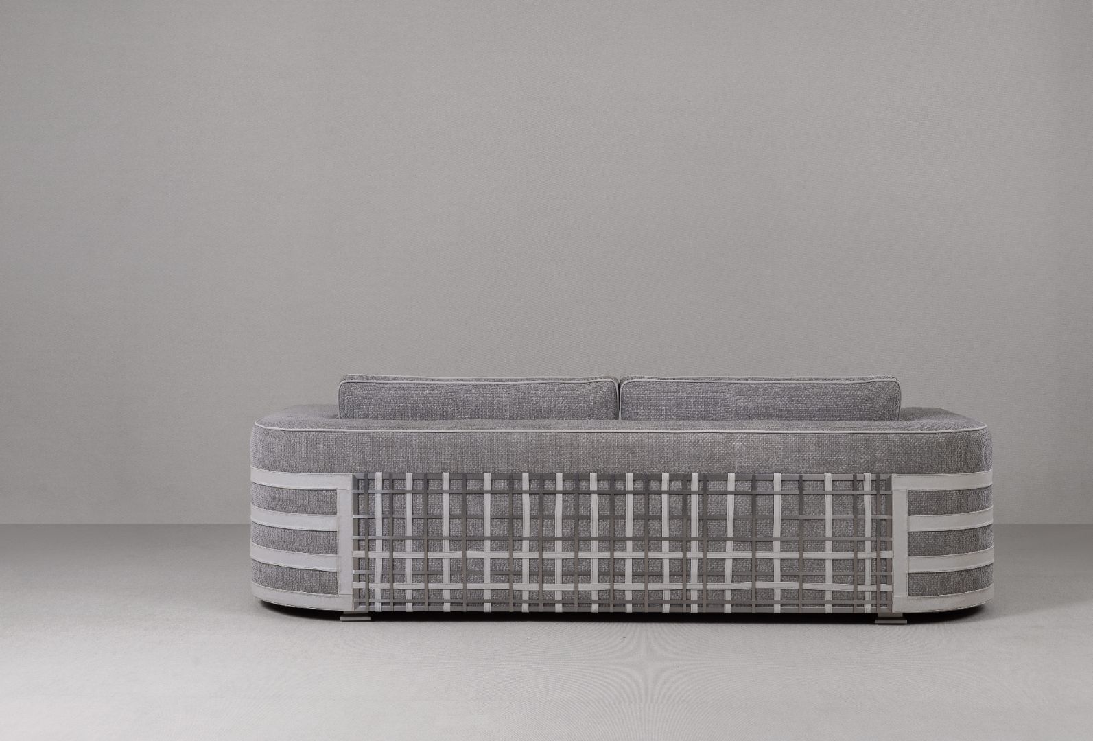 Defined yet inviting, this sofa welcomes relaxation with an unmistakable sense of luxury. Soft-touch gray mélange fabric is framed by contrasting piping that crisply defines the silhouette. Distinctive geometric weave and banding on the armrests and back add sculptural depth and character.