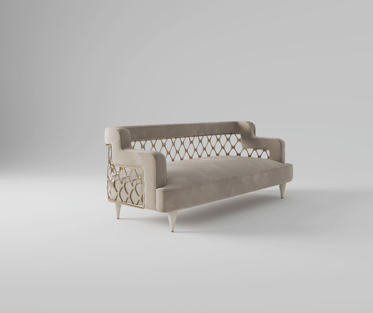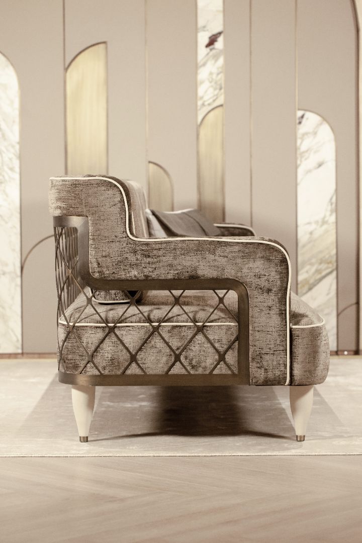 MATHIEU expresses sculptural elegance through refined detailing and balanced contrasts. A woven metal back, crafted like architectural jewelry, plays against the softness of generously padded volumes.